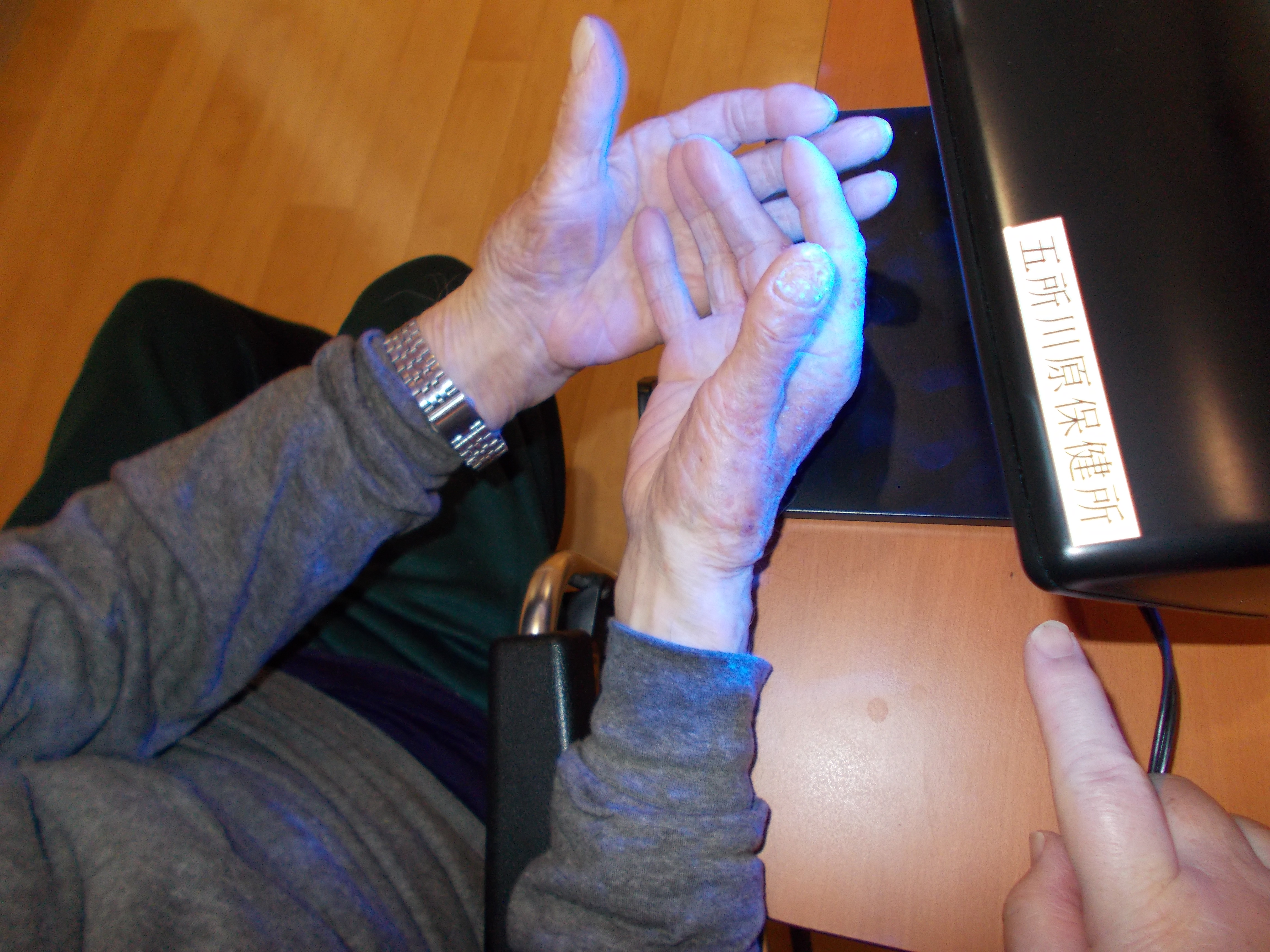 手に手洗いチェッカーと書かれた液体をぬりぬりして