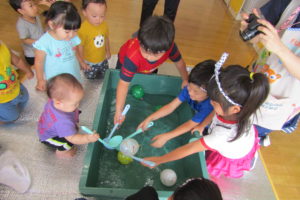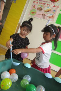 すくい方をていねいに教える姿に年長児としての自覚と優しさが見られました。