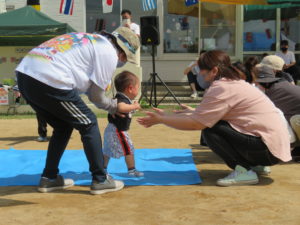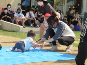 0歳児ちゃんは大好きなママめがけて、ブルーシートの上をハイハイや歩いてゴール!!