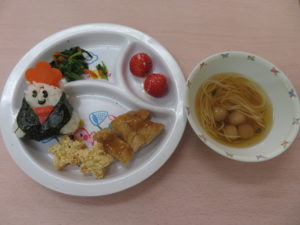 給食はおひなさまおにぎり・鶏の照り焼き・菜の花の和え物・星ポテト・すまし汁・練乳イチゴ