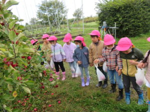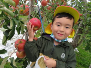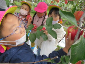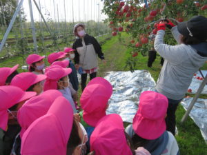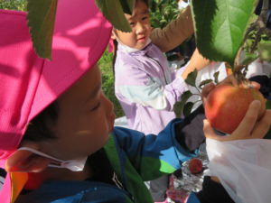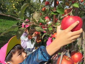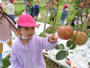 『りんごもぎ、したことある人いますかー?』