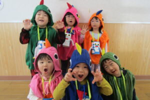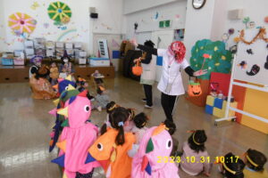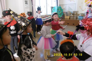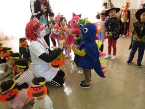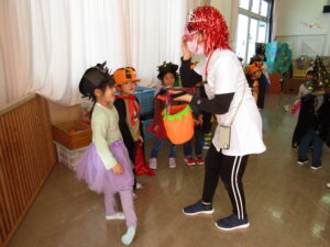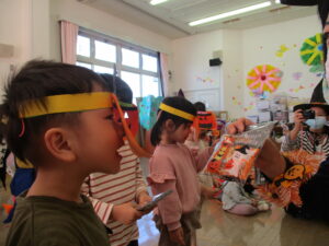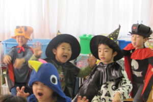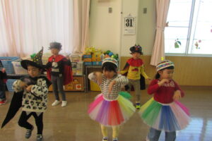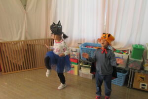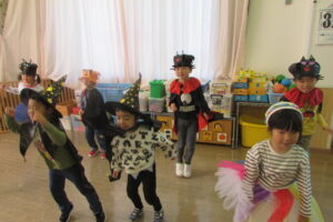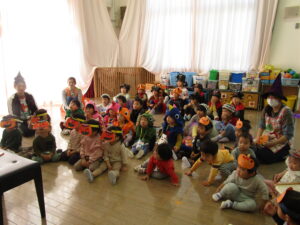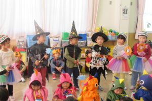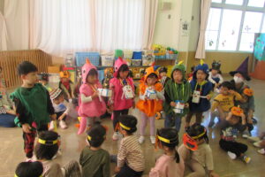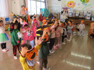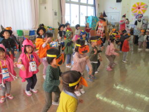 各クラスのお面と衣装を紹介し、見せ合いっこをした後はみんなで「ハロウィンダンス」♪