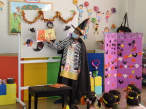 ハロウィンってなあに?絵本の読み聞かせは静かに聞き入っています👀