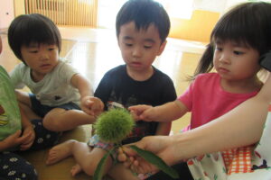 栗!!本物の栗を見て興味津々の子どもたち。