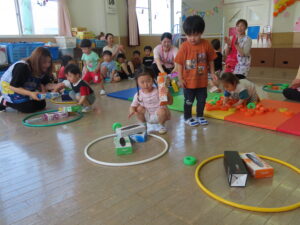 さくらんぼ組の0・1・2歳児さんは協力して高いお家を積み上げます。