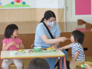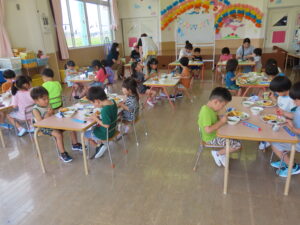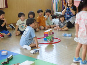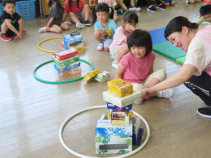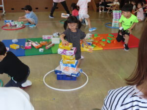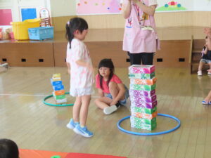 以上児のお友達は一人ずつの勝負!高く積み上げるには?と一人一人が考え積み上げました。