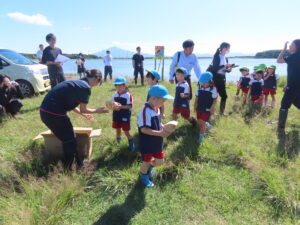職員の方より、放流の仕方のお話を聞き、