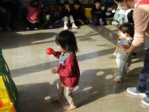 もも・りんごさんになると、走る勢いでプレゼントが宙を舞いひっくり返る子が数人(笑)