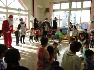 最後はサンタさんと保護者の方と皆で「ジングルベル」に合わせて踊りました。