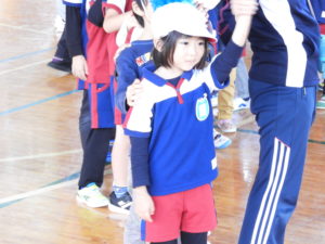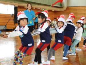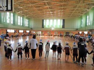 最後は全園児で大きな円になって「空は世界へ」のうたにのせてフォークダンスです。