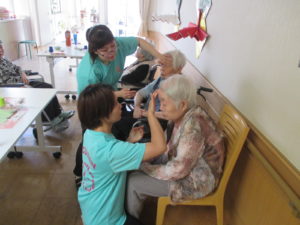 利用者様のお化粧や髪を整えて