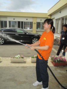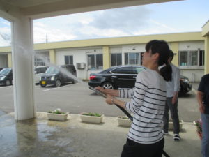 新人職員石川さんも笑顔で放水