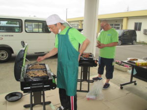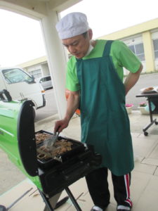 玄関でお肉を焼いて