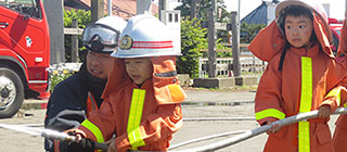 幼年消防クラブとして、イオン駐車場で行われる観閲式に参加しポンプ車操法・機械器具点検の演技を披露しています。消防署の方に指導していただき元気いっぱいの演技をし、火の用心を心がけています。
